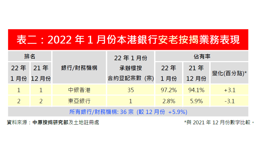 根據中原按揭研究部及土地註冊處數字指出,2022年1月錄得36宗安老按揭登記,與2021年12月份34宗相比,按月增加5.9%。自安老按揭計劃推出以來,中銀香港一直高踞巿佔率榜首位置,而1月的36宗登記中,中銀香港市佔率錄得高達97%,可見其於安老按揭登記之參與度極高。